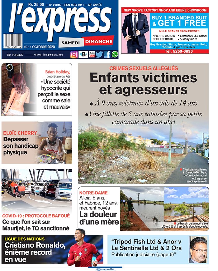 Votre journal deux en un de 80 pages en vente tout le week-end est en kiosque. Au coeur de l'actualité: Crimes sexuels allégués : Enfants victimes et agresseurs. Autre titre ; Brian Holiday, propriétaire du Ritz : «Une société hypocrite qui perçoit le sexe comme sale et mauvais»