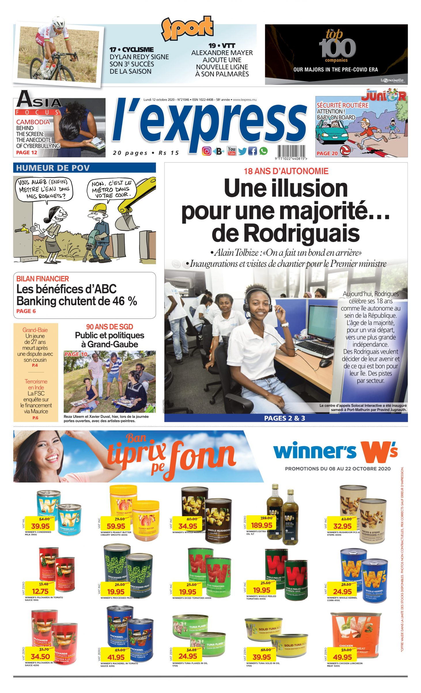 En une de l'express: Une illusion pour une majorité… de Rodriguais; Autre titre: Les bénéfices d’ABC Banking chutent de 46 %.