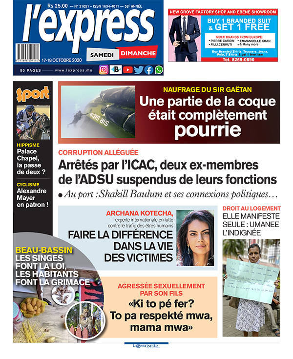 Votre journal deux en un de 80 pages en vente tout le week-end est en kiosque. Au coeur de l'actualité: Naufrage du Sir Gaëtan: une partie de la coque était complètement pourrie. Autre titre ; Corruption alléguée: arrêtés par l’ICAC, deux ex-membres de l’ADSU suspendus de leurs fonctions.
