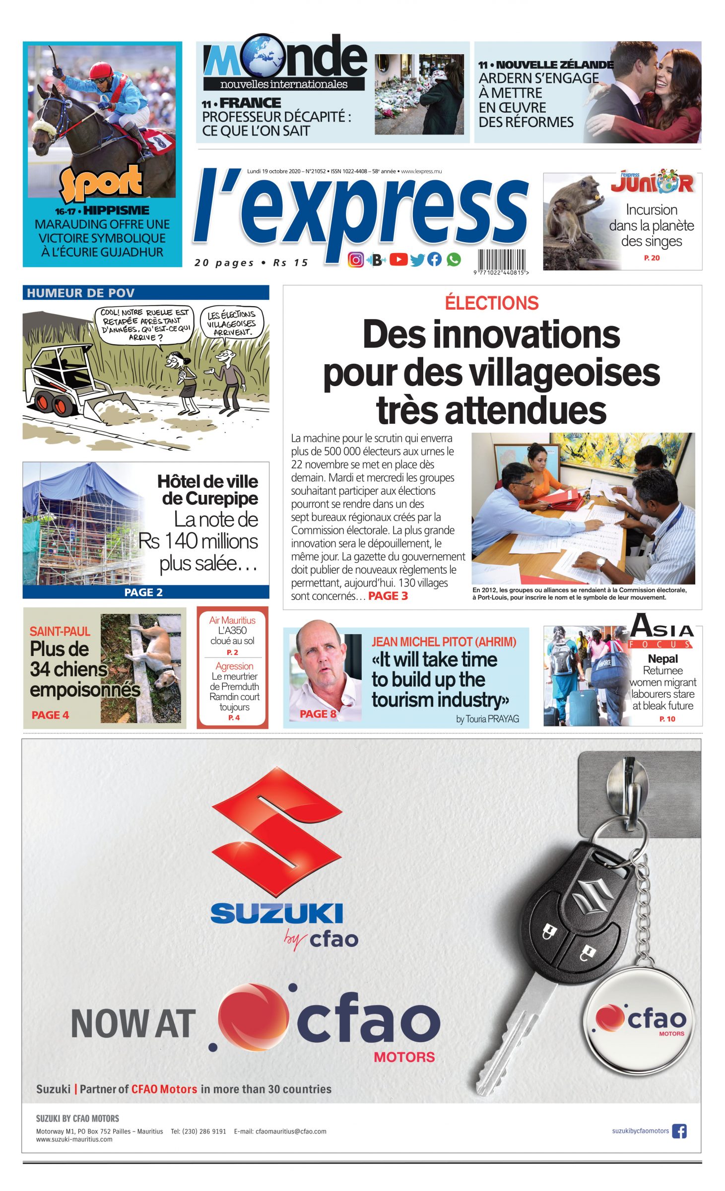 En une de l'express: Des innovations pour des villageoises très attendues,Autre titre; Hôtel de ville de Curepipe La note de Rs 140 millions plus salée…
