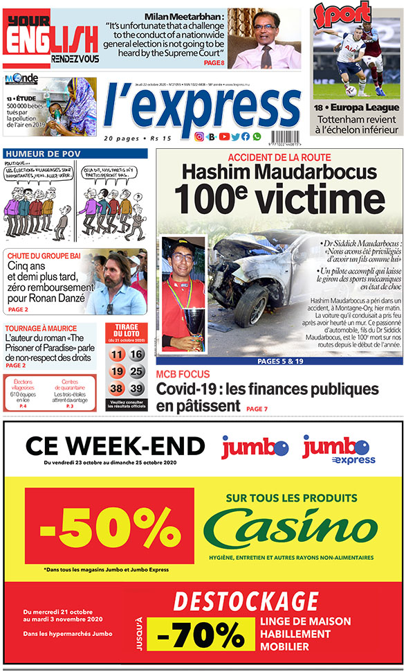 En une de l'express: Accident de la route: Hashim Maudarbocus, 100e victime ; Autre titre : Tournage à Maurice: l’auteur du roman «The Prisoner of Paradise» parle de non-respect des droits.