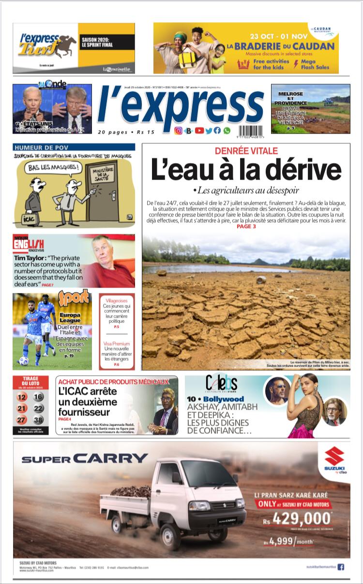 En une de l'express; Denrée vitale: L’eau à la dérive; Autre titre; Achat public de produits médicaux: L’ICAC arrête un deuxième fournisseur.