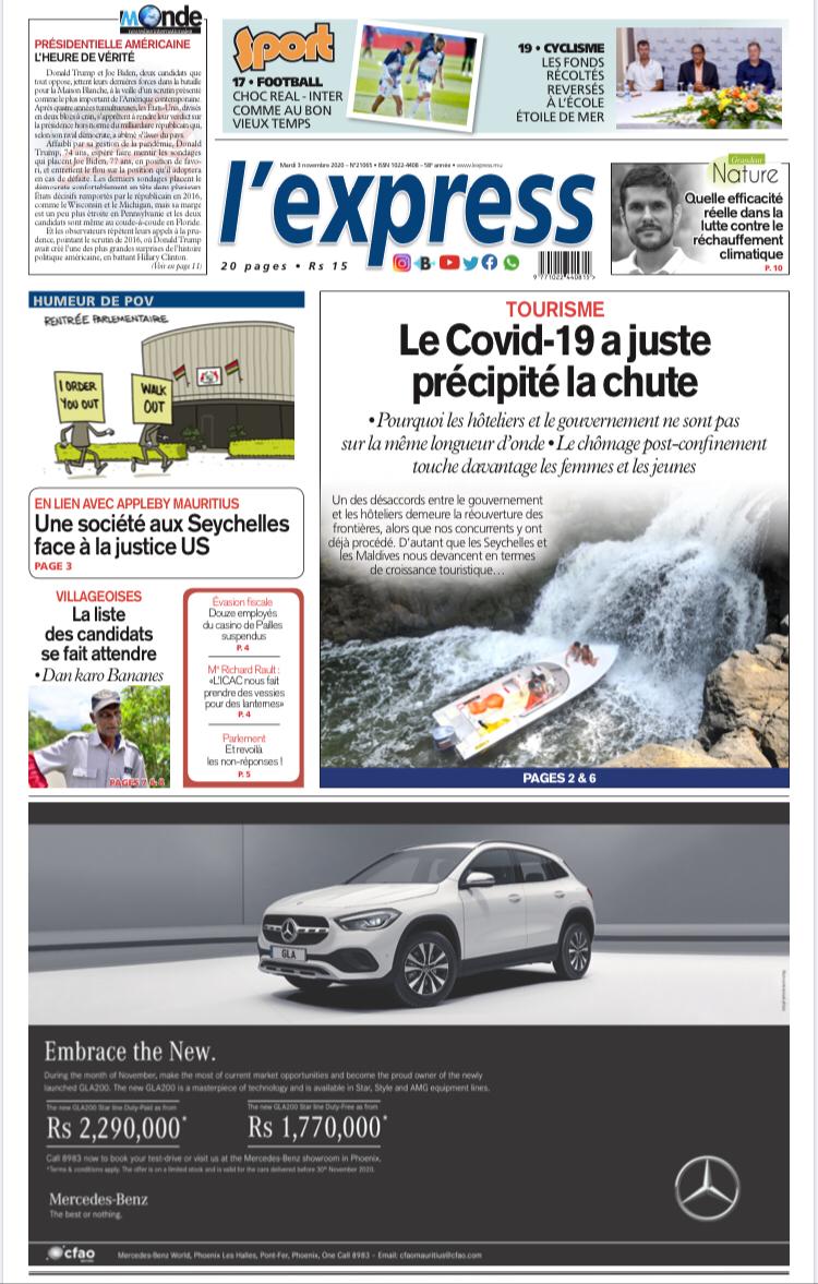 En une de l'express: Tourisme: le Covid-19 a juste précipité la chute; Autre titre : En lien avec Appleby Mauritius: une société aux Seychelles face à la justice US