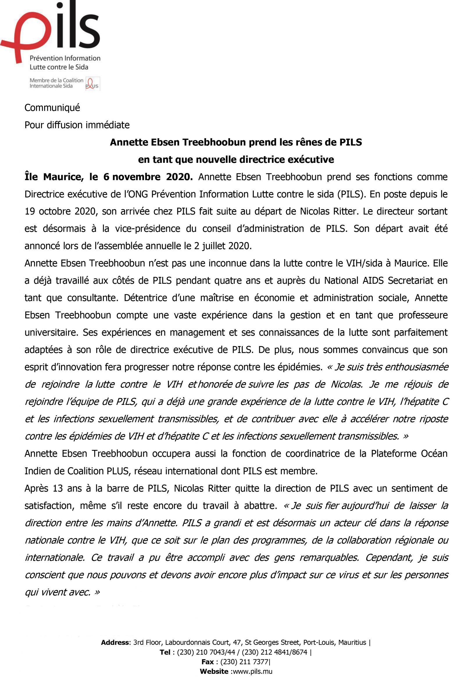 Elle sera la nouvelle figure de proue dans la lutte contre le VIH/Sida. Annette Ebsen Treebhoobun prend son poste de directrice exécutive de Prévention Information Lutte contre le sida (PILS). L’ONG l’a officialisé dans un communiqué de presse, ce vendredi 6 novembre :
