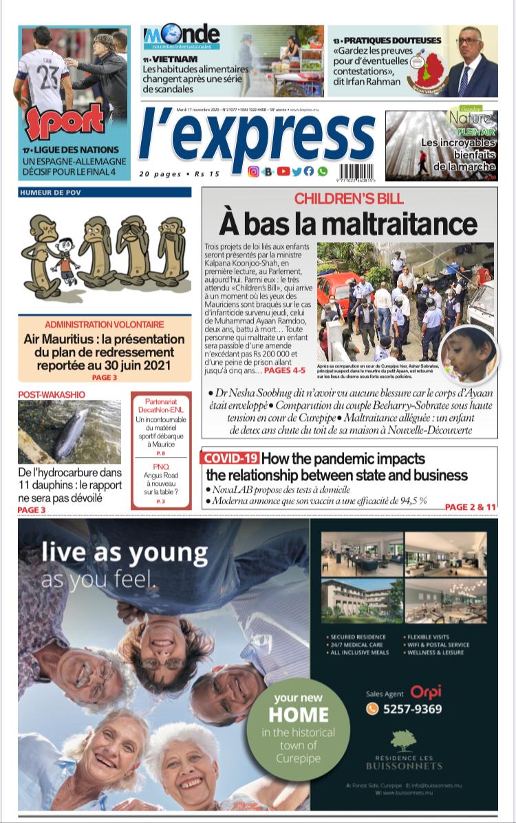 En une de l'express: Children’s Bill: à bas la maltraitance? ; Autre titre; Post-Wakashio: de l’hydrocarbure dans 11 dauphins : le rapport ne sera pas dévoilé
