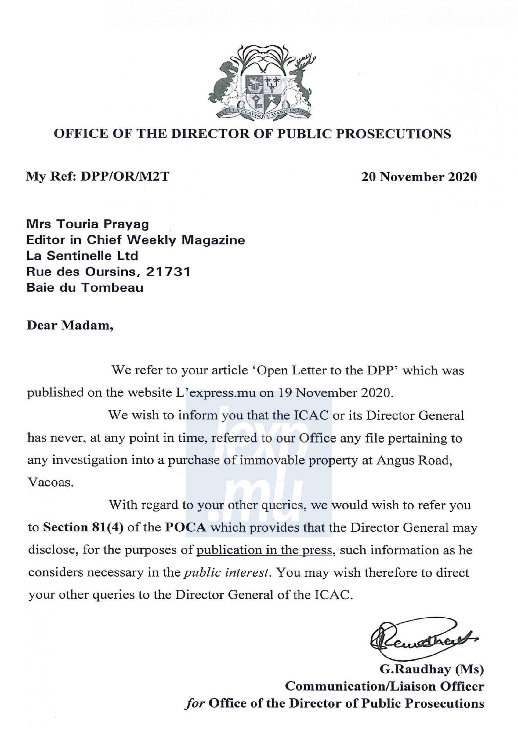Below is the reply of the director of public prosecutions (DPP) to the open letter sent to his office in these columns. We would like to place on record our sincere thanks for the celerity with which the matter was treated in the public interest. We received the reply below on the day following the publication of the request we made to his office. It is a major landmark in transparency and public accountability. We hope the other institutions follow suit in the public interest.