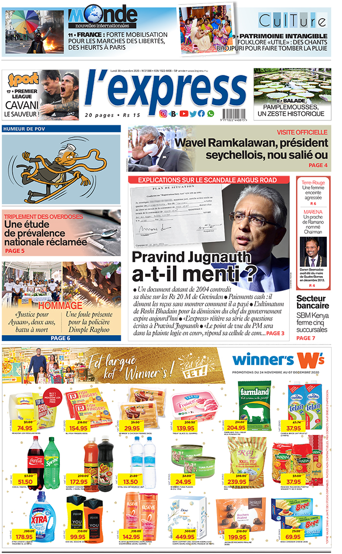 En une de l'express: Explications sur le scandale Angus Road : Pravind Jugnauth a-t-il menti ? Autre titre : Visite officielle : Wavel Ramkalawan, président seychellois, nou salié ou.