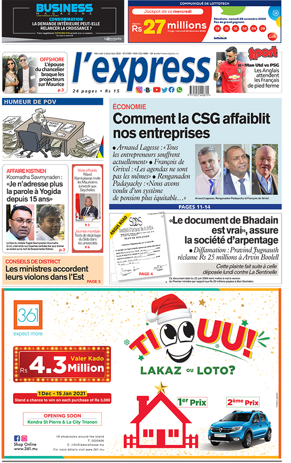 En un de lexpress de ce mercredi 2 décembre 2020 ; Économie: comment la CSG affaiblit nos entreprises ; Autre titre ; Angus Road: «Le document de Bhadain est vrai», assure la société d’arpentage