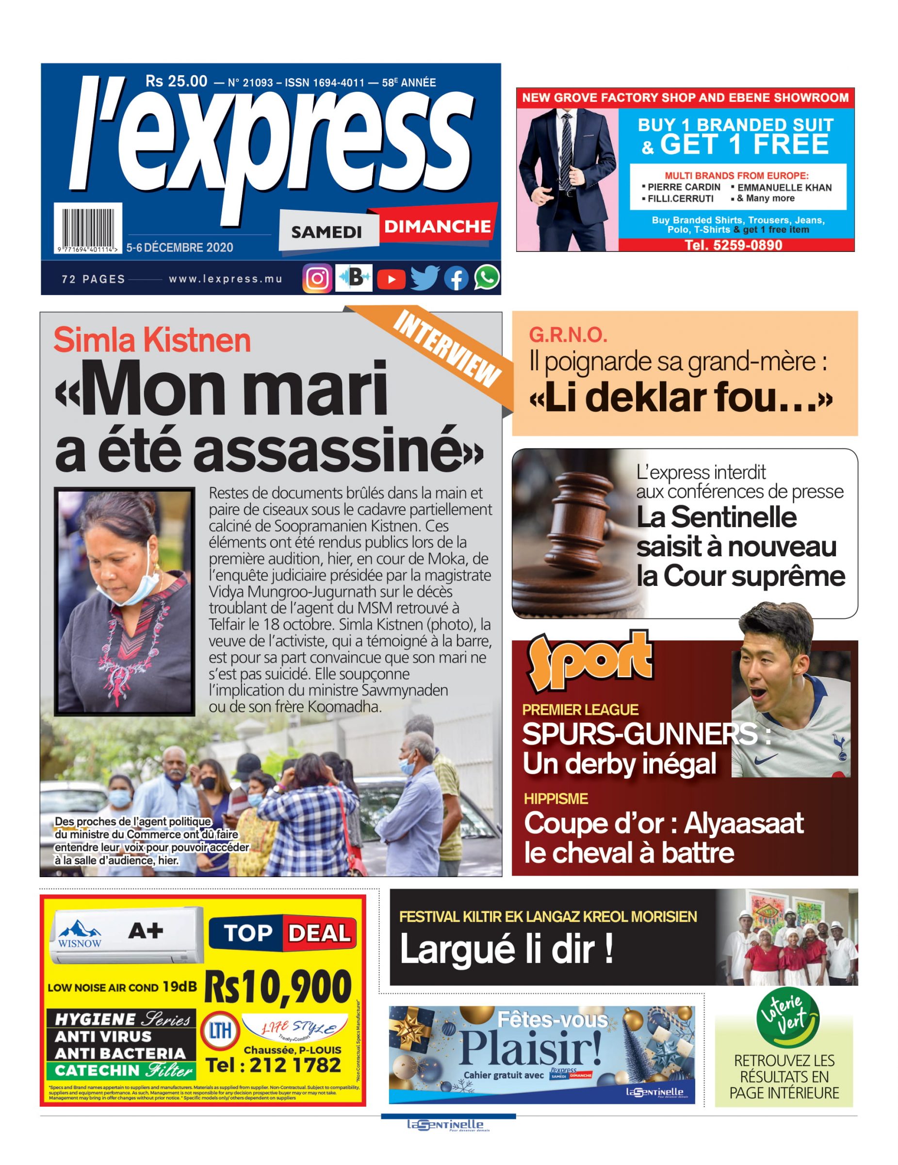 Votre journal deux en un de 80 pages en vente tout le week-end est en kiosque. Au coeur de l'actualité: Simla Kistnen «Mon mari a été assassiné»Autre titre; La Sentinelle saisit à nouveau la Cour suprême.