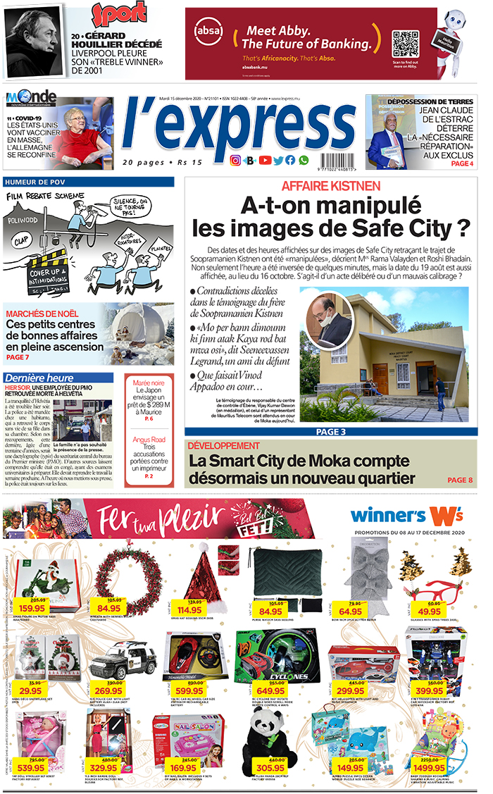En une de l'express de ce mardi 15 décembre 2020: Affaire Kistnen : A-t-on manipulé les images de Safe City ? Autre titre ; Développement : La Smart City de Moka compte désormais un nouveau quartier.