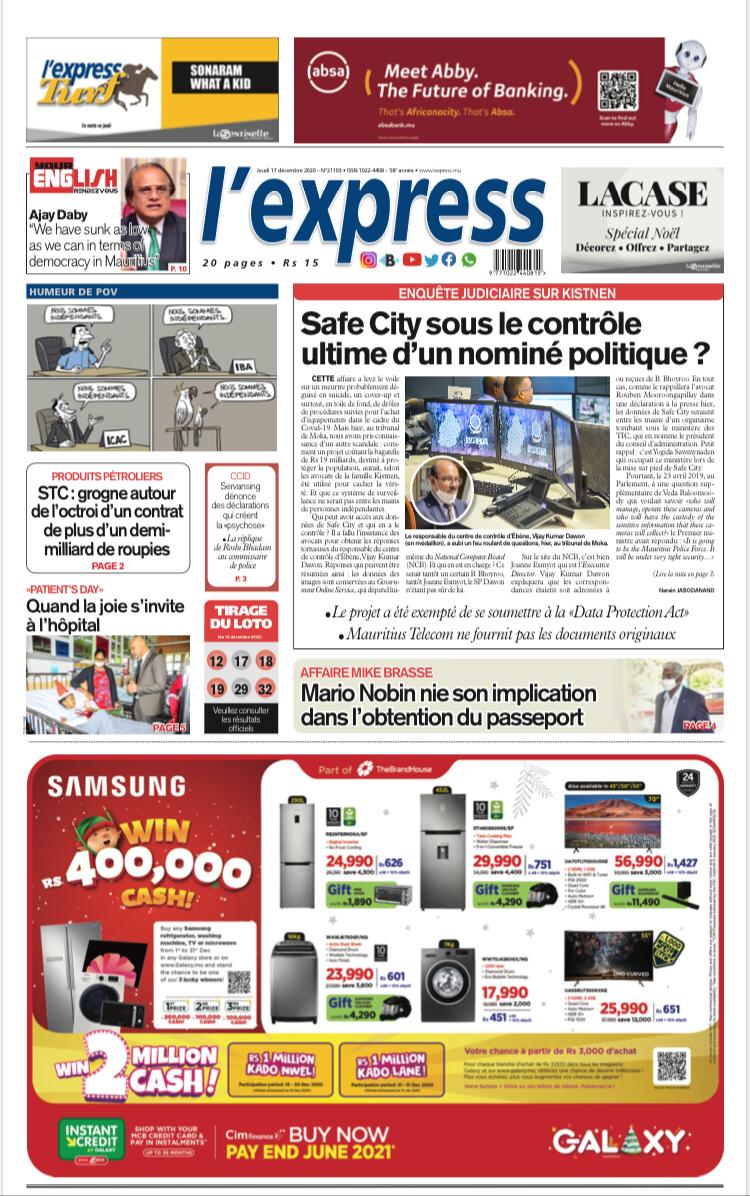 En une de l'express de ce jeudi 17 décembre 2020: Enquête judiciaire sur Kistnen: Safe City sous le contrôle ultime d’un nominé politique ? ; Autre titre ; Affaire Mike Brasse: Mario Nobin nie son implication dans l’obtention du passeport.