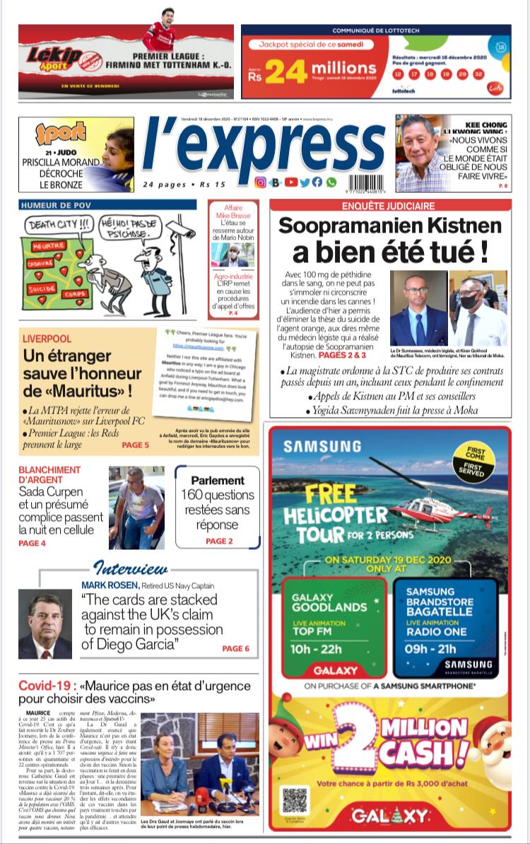 En une de l'express de ce vendredi 18 décembre 2020: Enquête judiciaire: Soopramanien Kistnen a bien été tué ! ; Autre titre ; Liverpool: Un étranger sauve l’honneur de «Mauritus» !