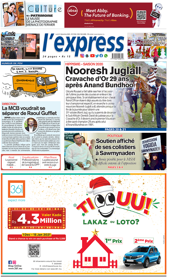 En une de l'express de ce lundi 21 décembre 2020: Hippisme – saison 2020 : Nooresh Juglall Cravache d’Or 29 ans après Anand Bundhoo. Autre titre ; Politique : Soutien affiché de ses colistiers à Sawmynaden.