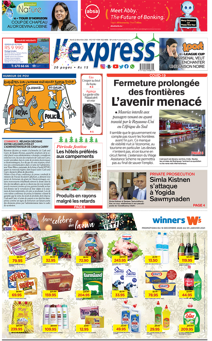 En une de l'express de ce mardi 22 décembre 2020: Fermeture prolongée des frontières : L’avenir menacé; Autre titre ; Private prosecution : Simla Kistnen s’attaque à Yogida Sawmynaden.