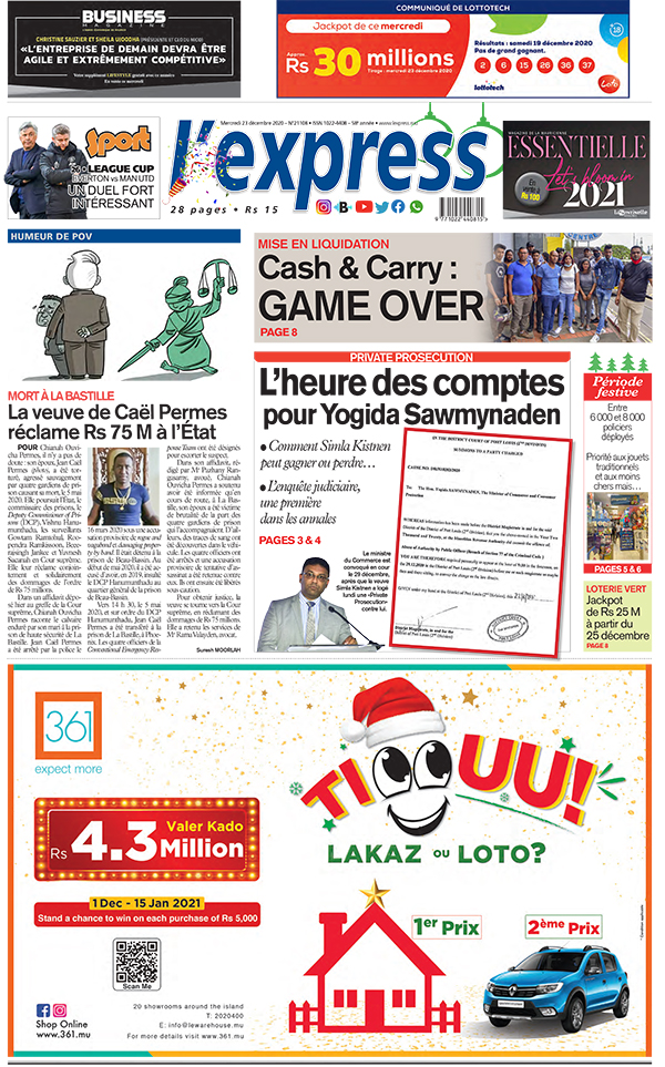 En une de l'express de ce mercredi 23 décembre; Private Prosecution: L’heure des comptes pour Yogida Sawmynaden ; Autre titre: Cash & Carry: Game over.