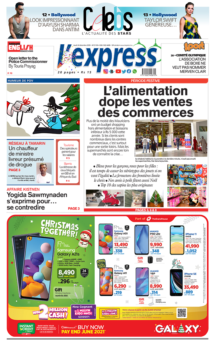 En une de l'express de ce jeudi 24 décembre; Période festive : L’alimentation dope les ventes des commerces ; Autre titre: Réseau à Tamarin : Un chauffeur de ministre livreur présumé de drogue.