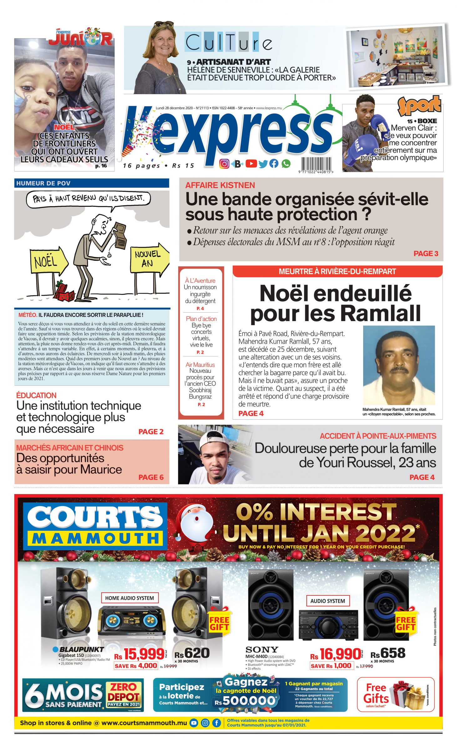 En une de l'express: Affaire Kistnen: Une bande organisée sévit-elle sous haute protection? ; Autre titre;Noël endeuillé pour les Ramlall.