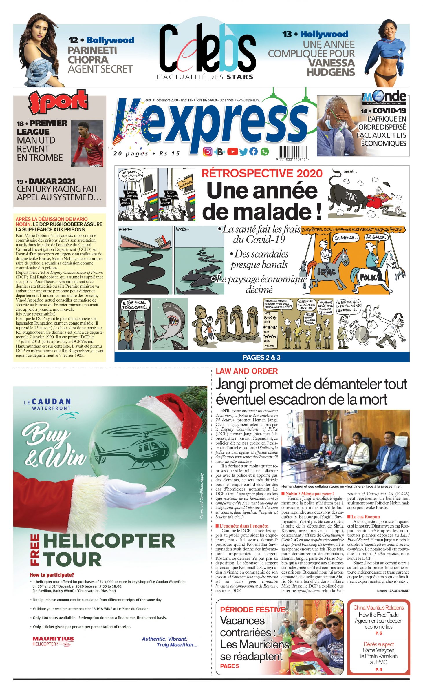 En une de l'express de ce jeudi 31 décembre:Rétrospective 2020: Une année de malade ! ; Autre titre: Jangi promet de démanteler tout éventuel escadron de la mort.