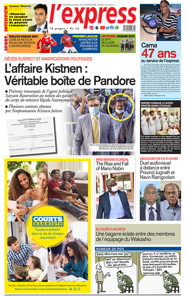 En une de l'express de ce dimanche 3 janvier 2021 ; L’affaire Kistnen: véritable boîte de Pandore ; Autre titre: Sameer Sharma: «Maurice va toucher le fond avant de pouvoir remonter».