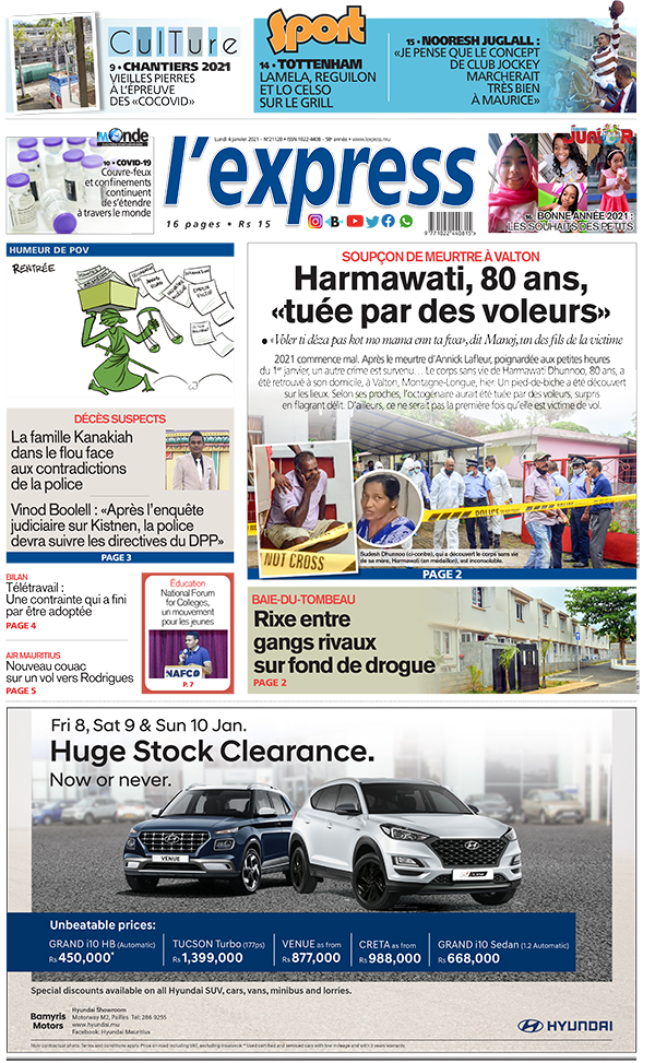 En une de l'express: Soupçon de meurtre à Valton: Harmawati, 80 ans, «tuée par des voleurs» ; Autre titre: Baie-du-Tombeau: Rixe entre gangs rivaux sur fond de drogue.