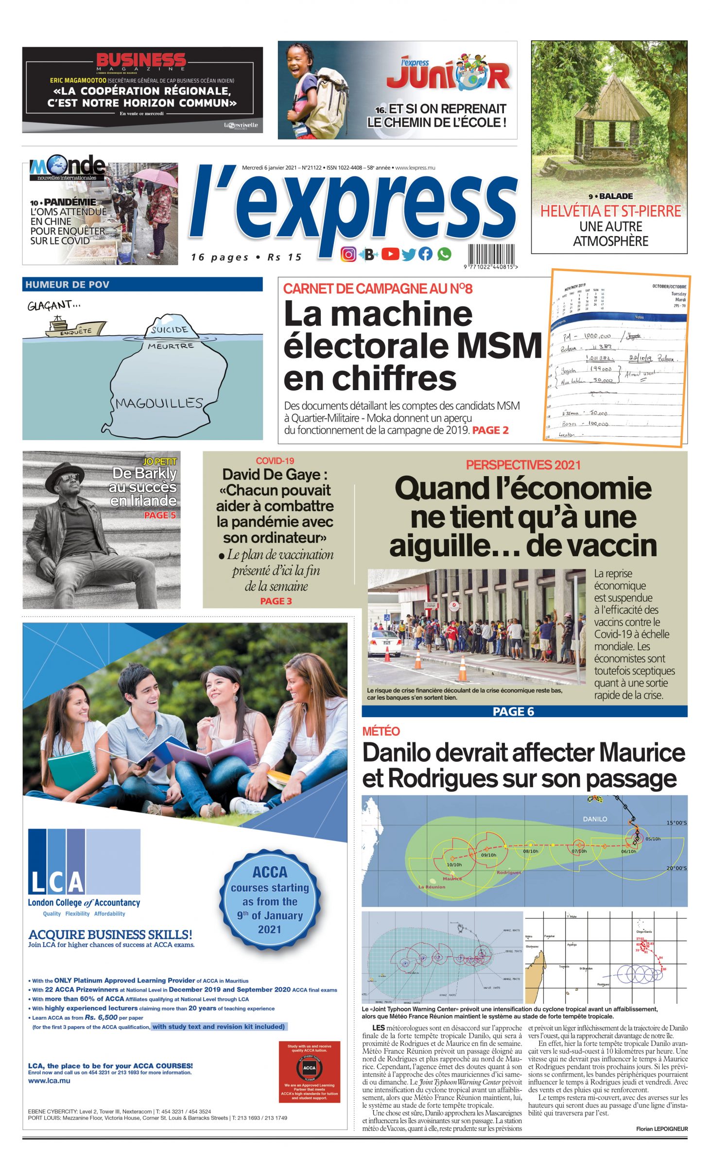 En une de l'express de ce mercredi 6 janvier 2021: La machine électorale MSM en chiffres ; Autre titre ; Quand l’économie ne tient qu’à une aiguille… de vaccin.