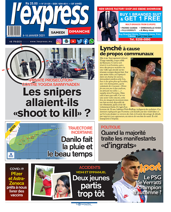 En une de l'express: «Private Prosecution» contre Yogida Sawmynaden: les snipers allaient-ils «shoot to kill» ? Autre titre: Accidents de la route: deux jeunes talents partis trop tôt.