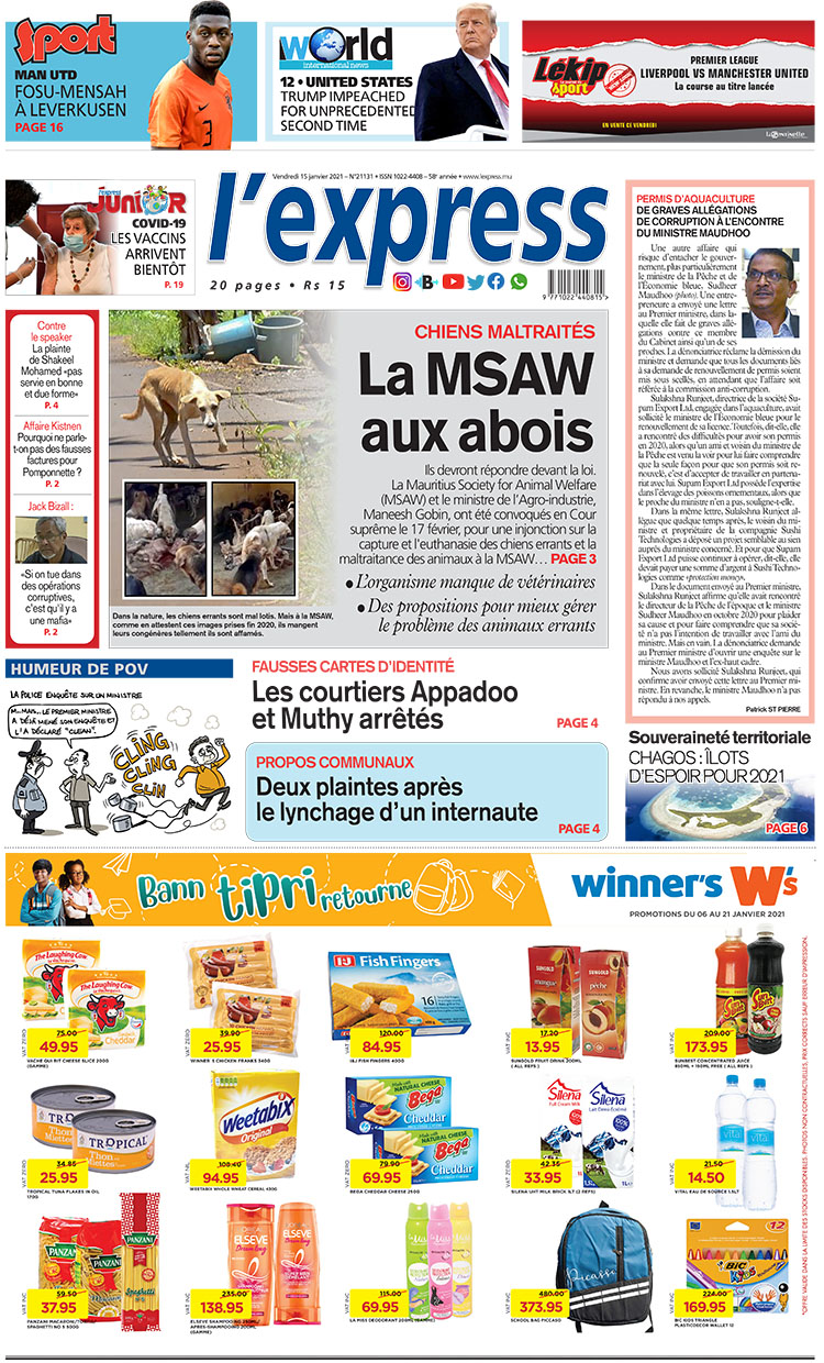 En une de l'express de ce vendredi 15 janvier 2021: Chiens maltraités: la MSAW aux abois ; Autre titre ; Fausses cartes d’identité: Les courtiers Appadoo et Muthy arrêtés.