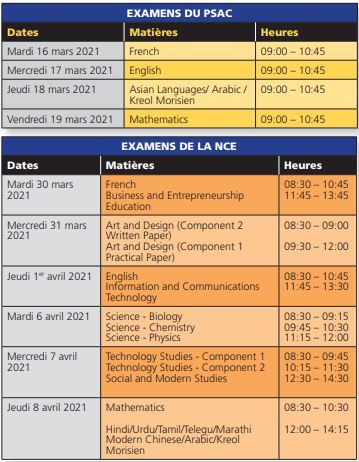 Le troisième trimestre ayant débuté depuis plus d’une semaine, il ne reste pas beaucoup de temps avant le début des examens finaux. En ce qui concerne ceux du School Certificate (SC) et du Higher School Certificate (HSC) les dates n’ont pas encore été annoncées par le Mauritius Examinations Syndicate. Idem pour la fin du trimestre et les vacances scolaires. La grande rentrée est fixée, quant à elle, au 25 juin 2021. Les épreuves du National Certificate Examination (NCE) auront lieu du 30 mars au 8 avril 2021. Celles du Primary School Achievement Certificate (PSAC) se tiendront du 16 au 19 mars 2020 et le trimestre se termine le vendredi 26 mars 2021.