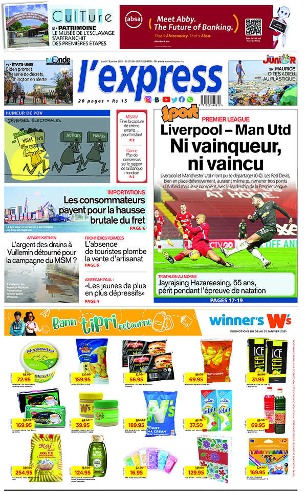 En une l'express de ce lundi 18 janvier 2021: Premier League: Liverpool – Man Utd, Ni vainqueur, ni vaincu ; Autre titre: Mort suspecte de Kistnen: La construction de drains sert-elle à financer la campagne électorale ?