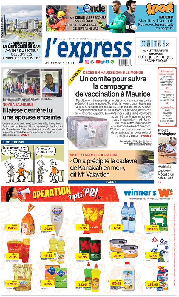 En une de l'express de ce lundi: Décès en hausse dans le monde: un comité pour suivre la campagne de vaccination à Maurice ; Autre titre : Me Rama Valayden: «C’est un cadavre qu’on a précipité en mer».