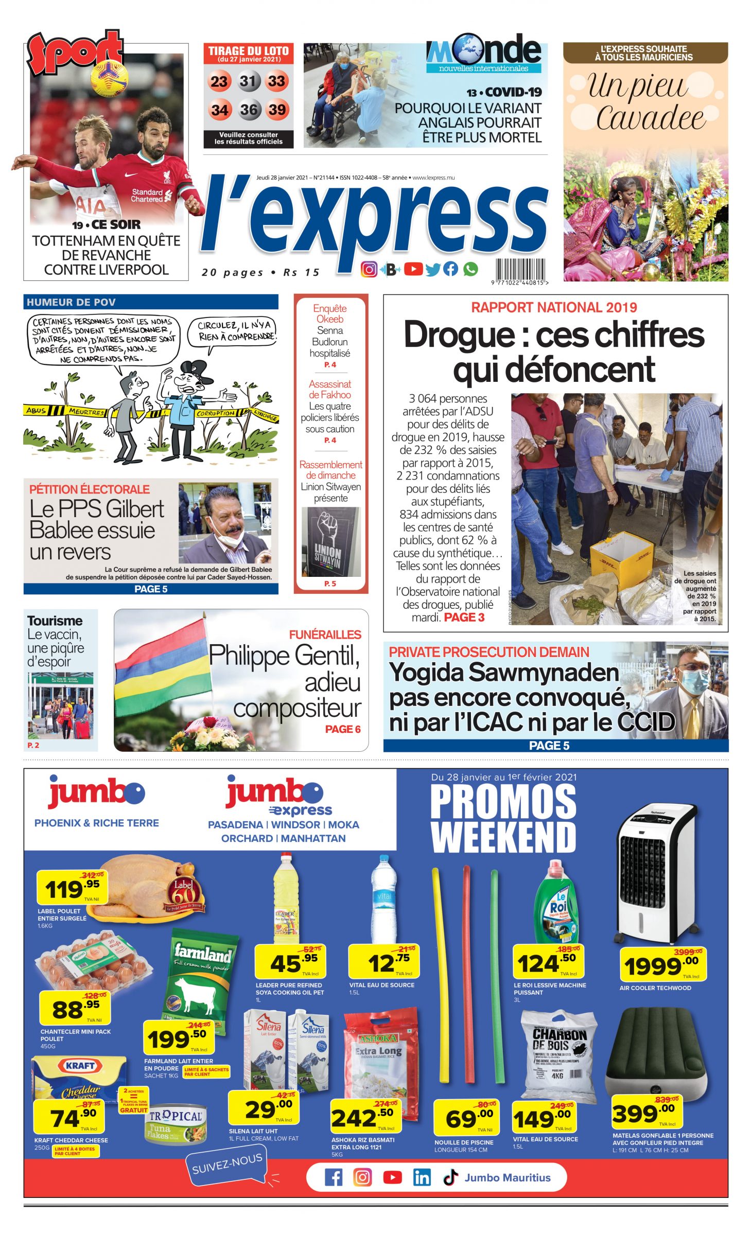 En une de l'express : Drogue : ces chiffres qui défoncent ; Autre titre: Yogida Sawmynaden pas encore convoqué, ni par l’ICAC ni par le CCID