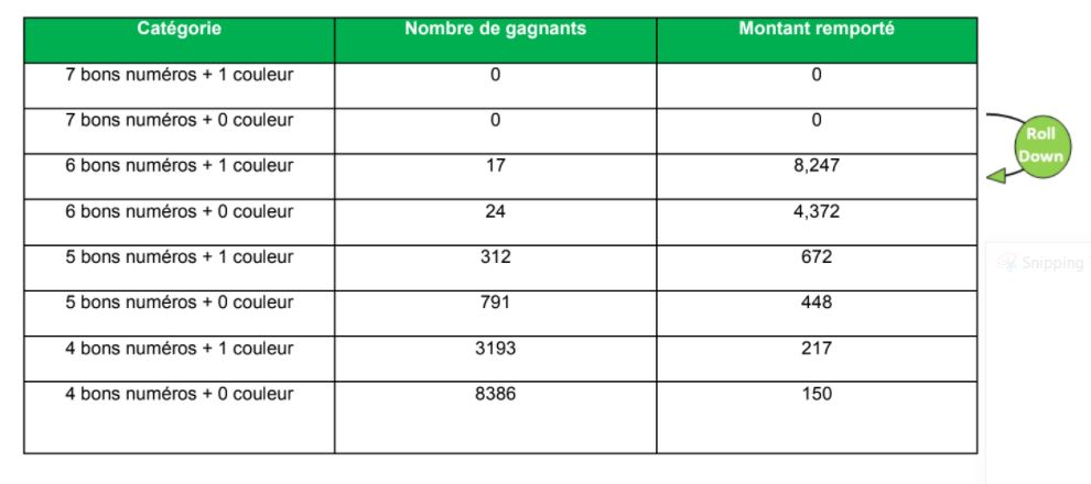 Puisqu’aucun joueur n’a trouvé la combinaison gagnante pour ce 13e tirage de la Loterie Vert, le roll over s’appliquant, le gros lot du vendredi 5 février 2021 passe donc à approximativement Rs 40 millions.La combinaison gagnante de ce tirage du 29 janvier 2020 est : 09-11-14-15-19-20-25 et la couleur rouge
