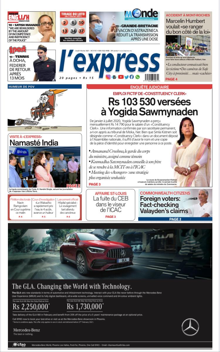 En une de l'express : Enquête judiciaire: Emploi fictif de «Constituency Clerk» : Rs 103 530 versées à Yogida Sawmynaden; Autre titre : Affaire St-Louis: La fuite du CEB dans le viseur de l’ICAC