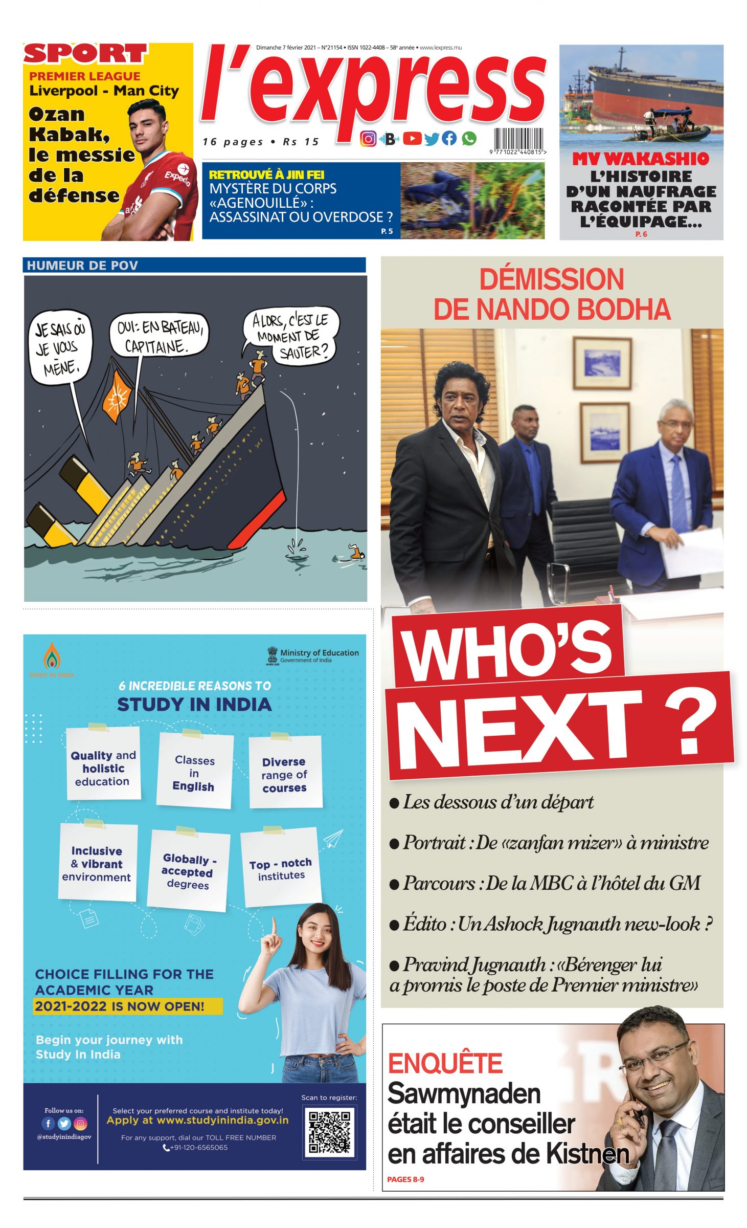 En une de l'express de ce dimanche 7 février 2021;Démission de Nando Bodha: who's next? Autre titre; Sawmynaden était le conseiller en affaires de Kistnen