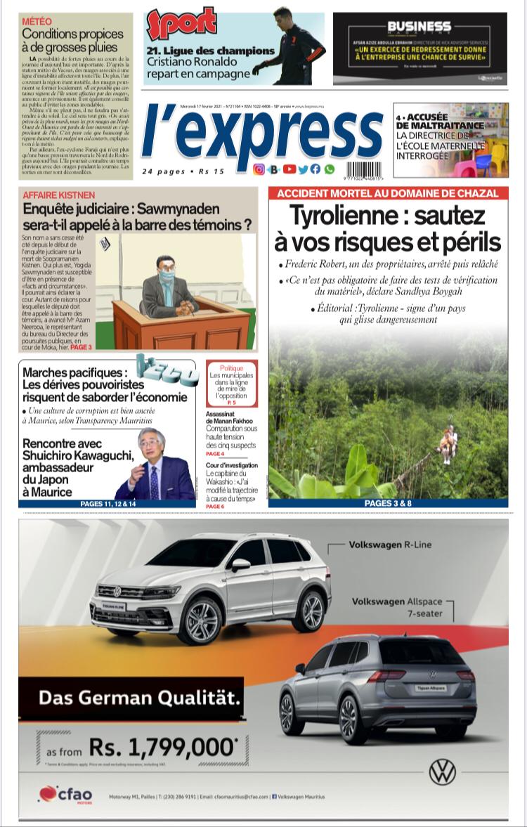 En une de l'express: Accident mortel au Domaine de Chazal: Tyrolienne: sautez à vos risques et périls; Autre titre: Affaire Kistnen: Enquête judiciaire : Sawmynaden sera-t-il appelé à la barre des témoins ?
