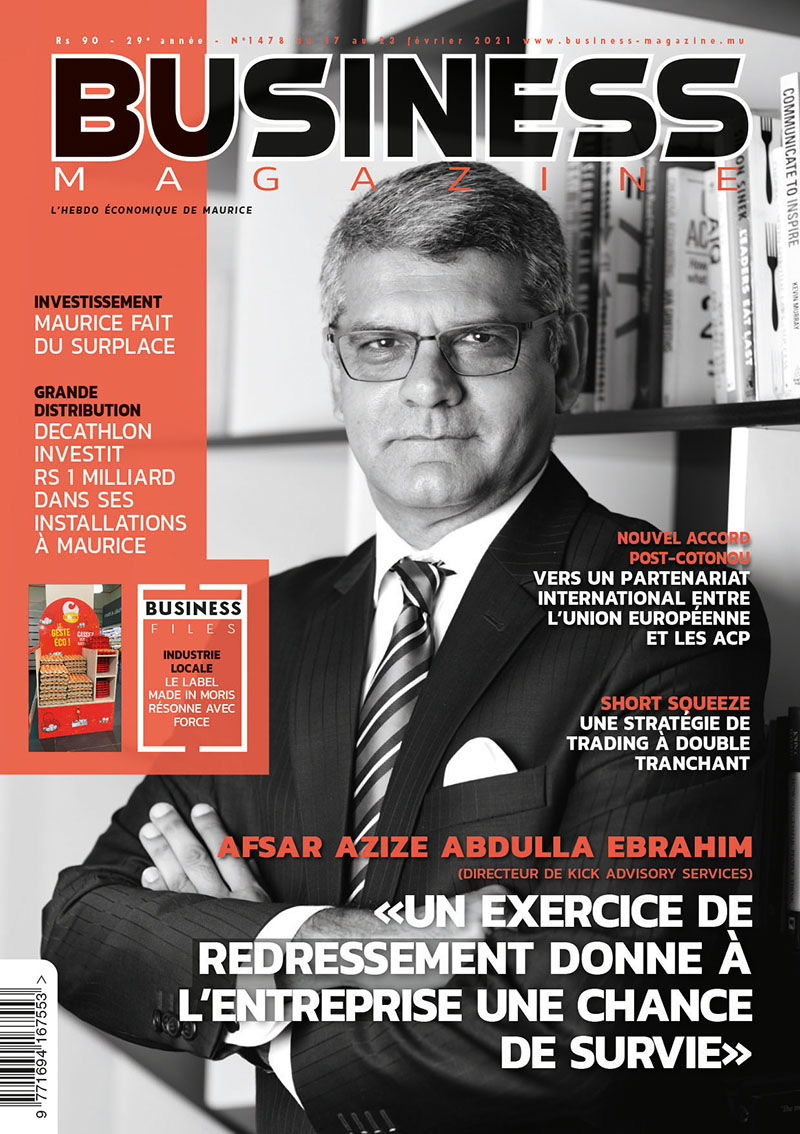 Les campagnes de vaccination dans le monde entier jouent un rôle énorme dans le rétablissement de la confiance dans l’économie mondiale, observe le directeur et partenaire fondateur de KICK Advisory Services. Pour Afsar Ebrahim, au vu de sa petitesse qui limite sa croissance, l’économie mauricienne a cruellement besoin de capitaux et d’investissements étrangers. De même, il nous faut élargir notre marché en nous recentrant sur l’Afrique. Il insiste, par ailleurs, sur la nécessité de renforcer le partenariat entre le secteur public et le privé. Retrouvez l’entretien en couverture de Business Magazine ce mercredi 17 février 2021, un numéro à retrouver aux points de vente habituels et sur https://kiosk.lasentinelle.mu/presse/business-mag/