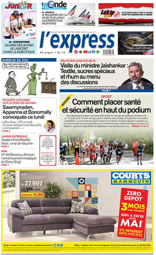 En une de l'express: Sport : Comment placer santé et sécurité en haut du podium; Autre titre: Visite du ministre Jaishankar : Textile, sucres spéciaux et rhum au menu des discussions.