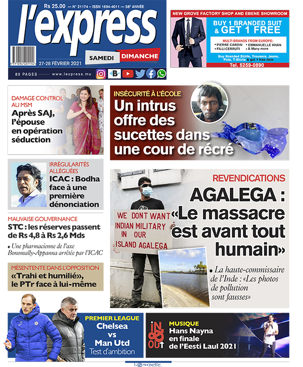 En une de l'express: Revendications - Agalega : «Le massacre est avant tout humain»; Autre titre: Insécurité à l’école : Un intrus offre des sucettes dans une cour de récré.