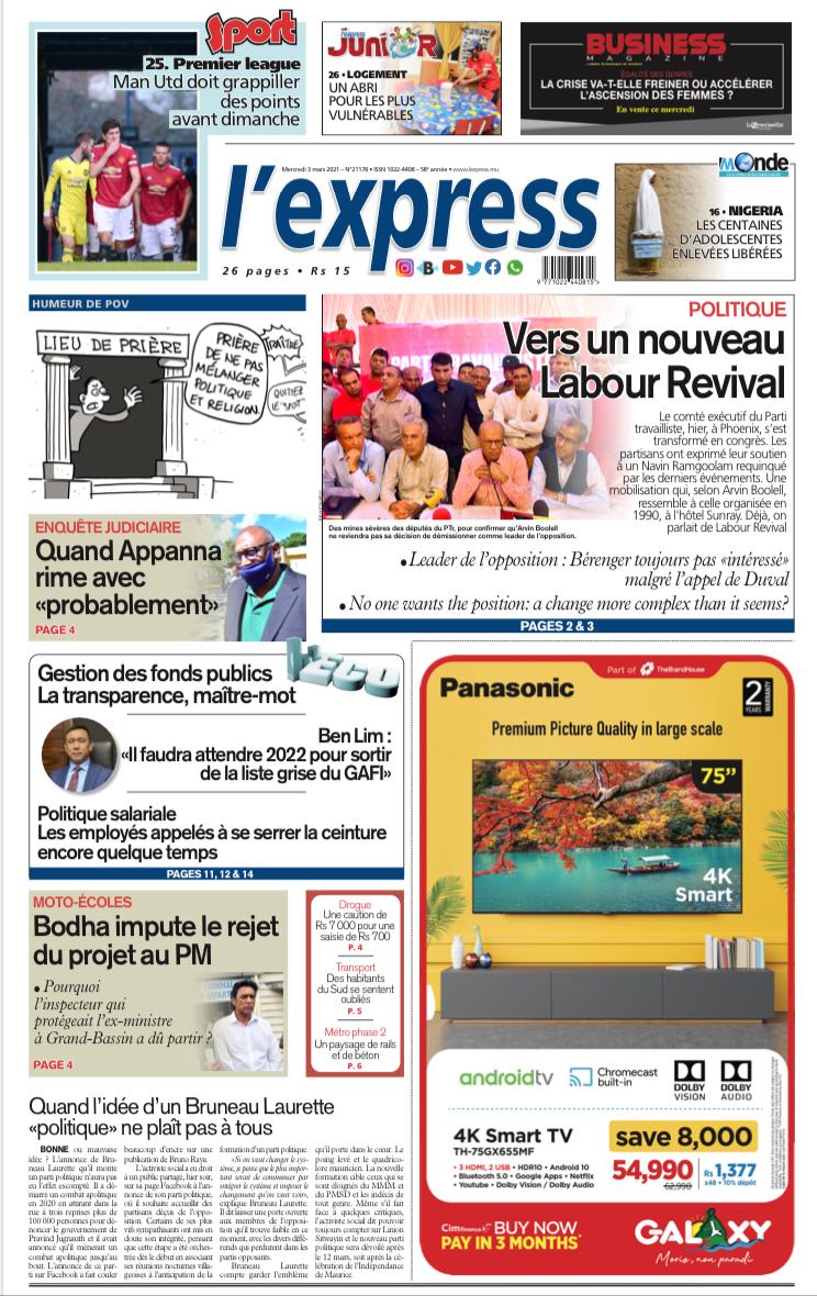 En une de l'express: Politique: Vers un nouveau Labour Revival; Autre titre: Enquête judiciaire: Quand Appanna rime avec «probablement».