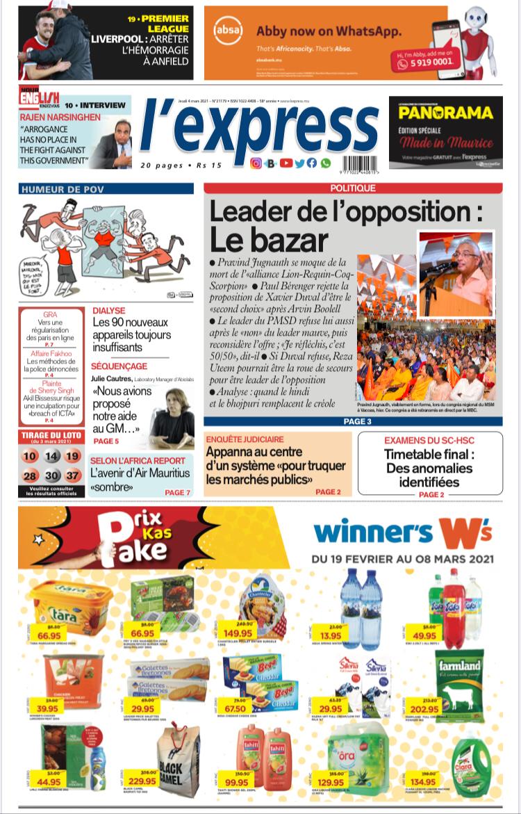 En une de l'express: Politique: Leader de l’opposition : Le bazar; Autre titre: Enquête judiciaire: Appanna au centre d’un système «pour truquer les marchés publics».