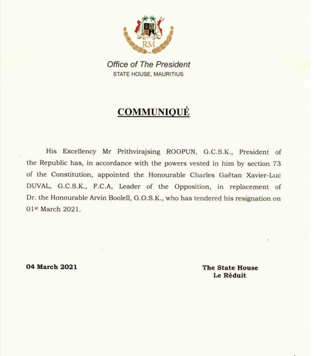 Le Président de la République a officiellement avalisé cette nomination cet après-midi en vertu de l’article 73 de la Constitution. «J’occuperai ce poste pendant un certain temps, en attendant de voir comment cela se passe, notamment par rapport à l’attitude du Speaker envers le Leader de l’Opposition», a déclaré le nouveau leader de l’opposition dans un communiqué émis peu après l’officialisation de sa nomination. «Je rappelle aussi que nous sommes cinq députés du PMSD sur un total de 27 députés de l’opposition. J’assumerai mes responsabilités aussi longtemps que j’aurais la confiance de tout un chacun». D’ailleurs, l’ex-ministre Nando Bodha a tenu à féliciter Xavier-Luc Duval dans un poste publié sur sa page Facebook. «Je suis certain que l’Honorable Xavier-Luc Duval créera une belle synergie au sein de l’opposition, d’autant plus qu’il bénéficie de l’appui total de l’Honorable Paul Bérenger et de l’Honorable Arvin Boolell» a-t-il écrit.