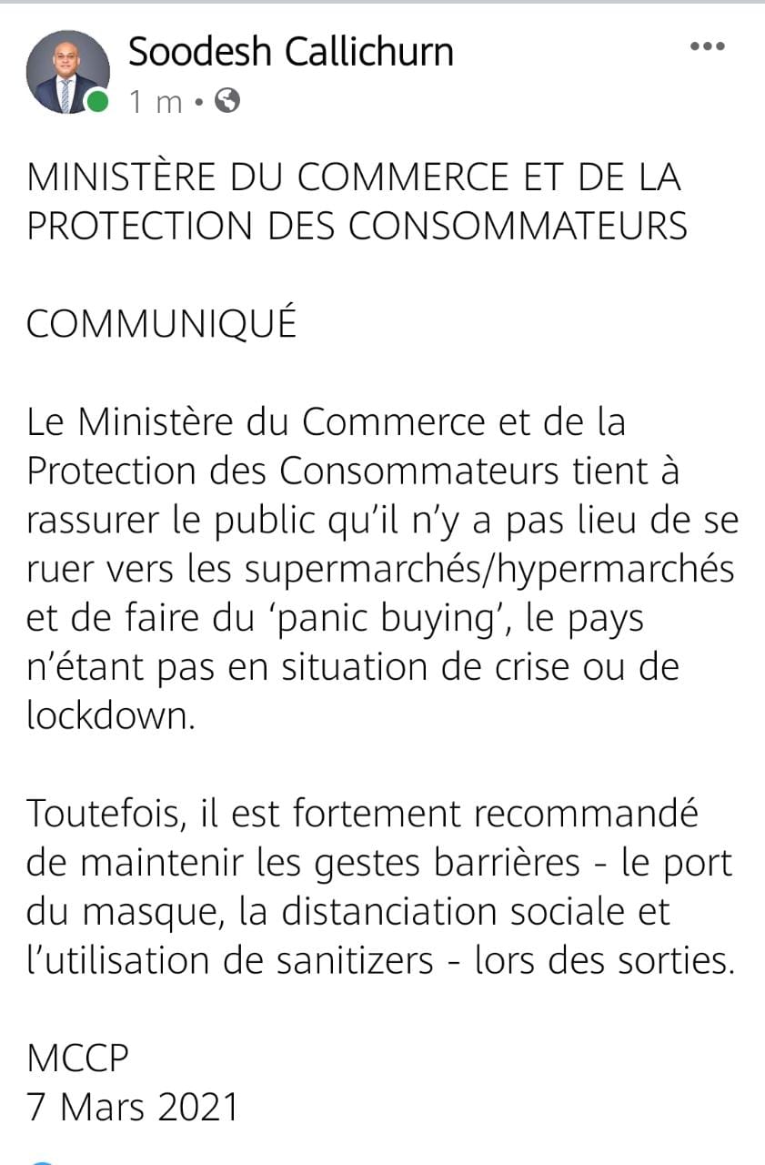 Les consommateurs sont nombreux à se ruer vers les supermarchés à travers le pays, ce dimanche 7 mars. A Vacoas ce matin, les chariots était remplis devant les guichets d’un supermarché alors qu’il y avait une longue file d’attente à l’extérieur. Des scènes qui ressemblent beaucoup à celles de mars 2020. Fait notable : les personnes prennent le soin de favoriser la distanciation sociale et le port du masque.