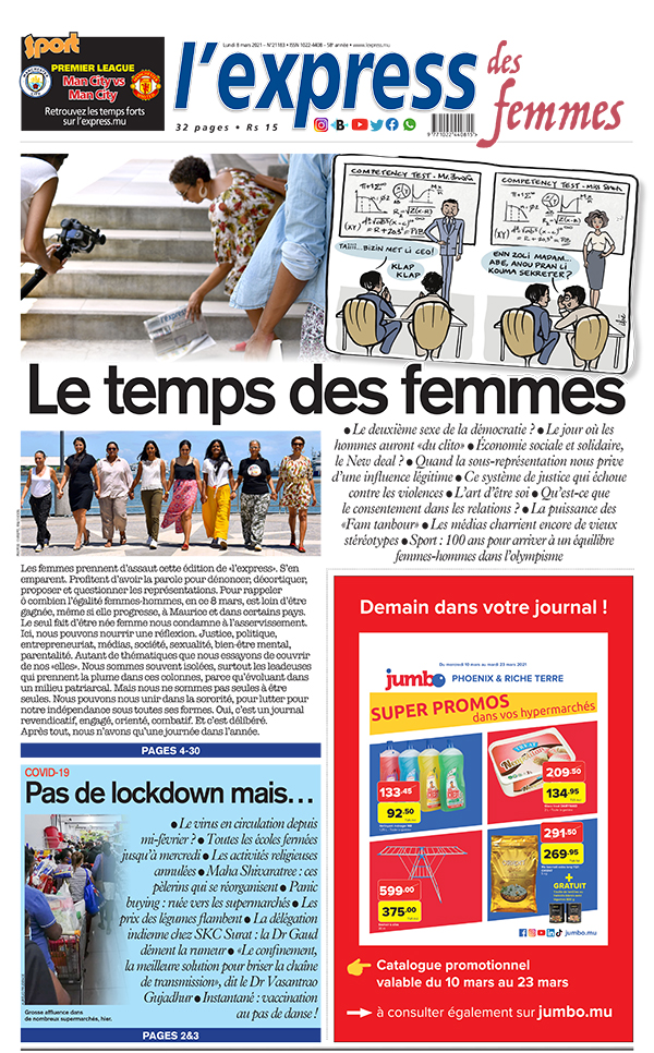 En une de l'express des femmes de ce lundi 8 mars 2021: Le temps des femmes ; Autre titre: Covid-19: pas de lockdown mais…