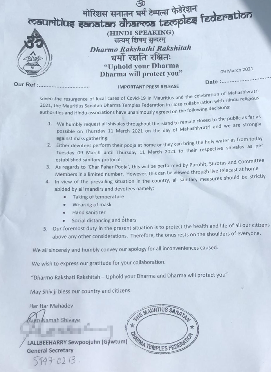 Le diocèse de Port-Louis a établi des consignes à observer à partir du 1er avril et ce, jusqu’à de nouvelles directives de la part du Gouvernement :
