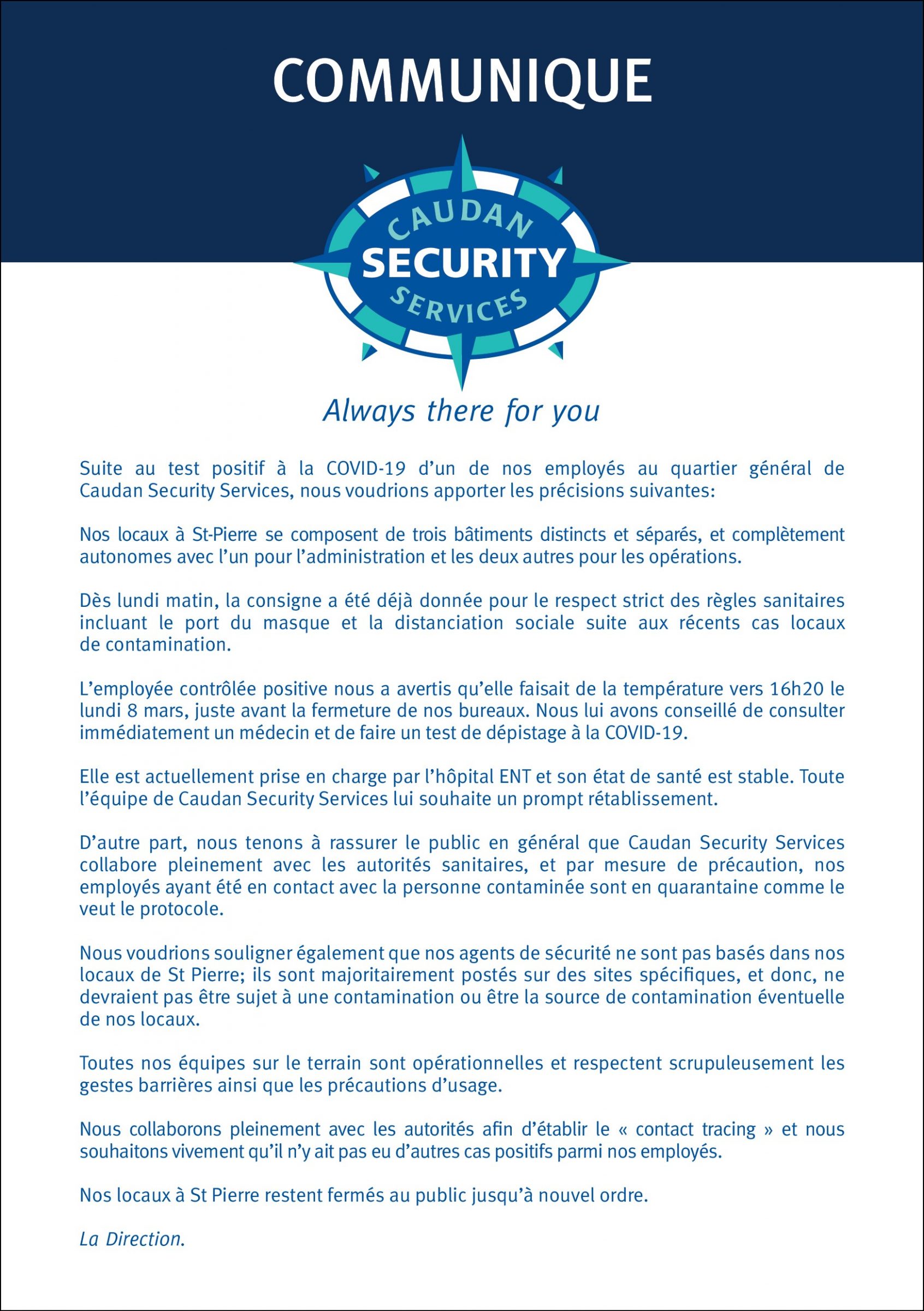 La CAP profite pour saluer le dévouement du personnel de sante et leur remercie pour les efforts consentis en cette période de crise.