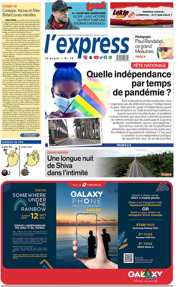 En une de l'express: Fête nationale: quelle indépendance par temps de pandémie ? Autre titre: Covid-19: Curepipe, Vacoas et Allée Brillant zones interdites.