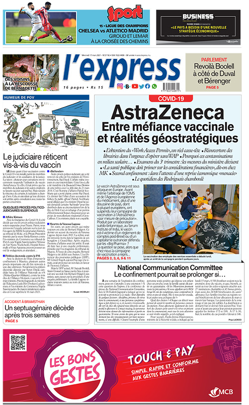 En une de l'express: Covid-19 – AstraZeneca : Entre méfiance vaccinale et réalités géostratégiques ; Autre titre: Le judiciaire réticent vis-à-vis du vaccin.