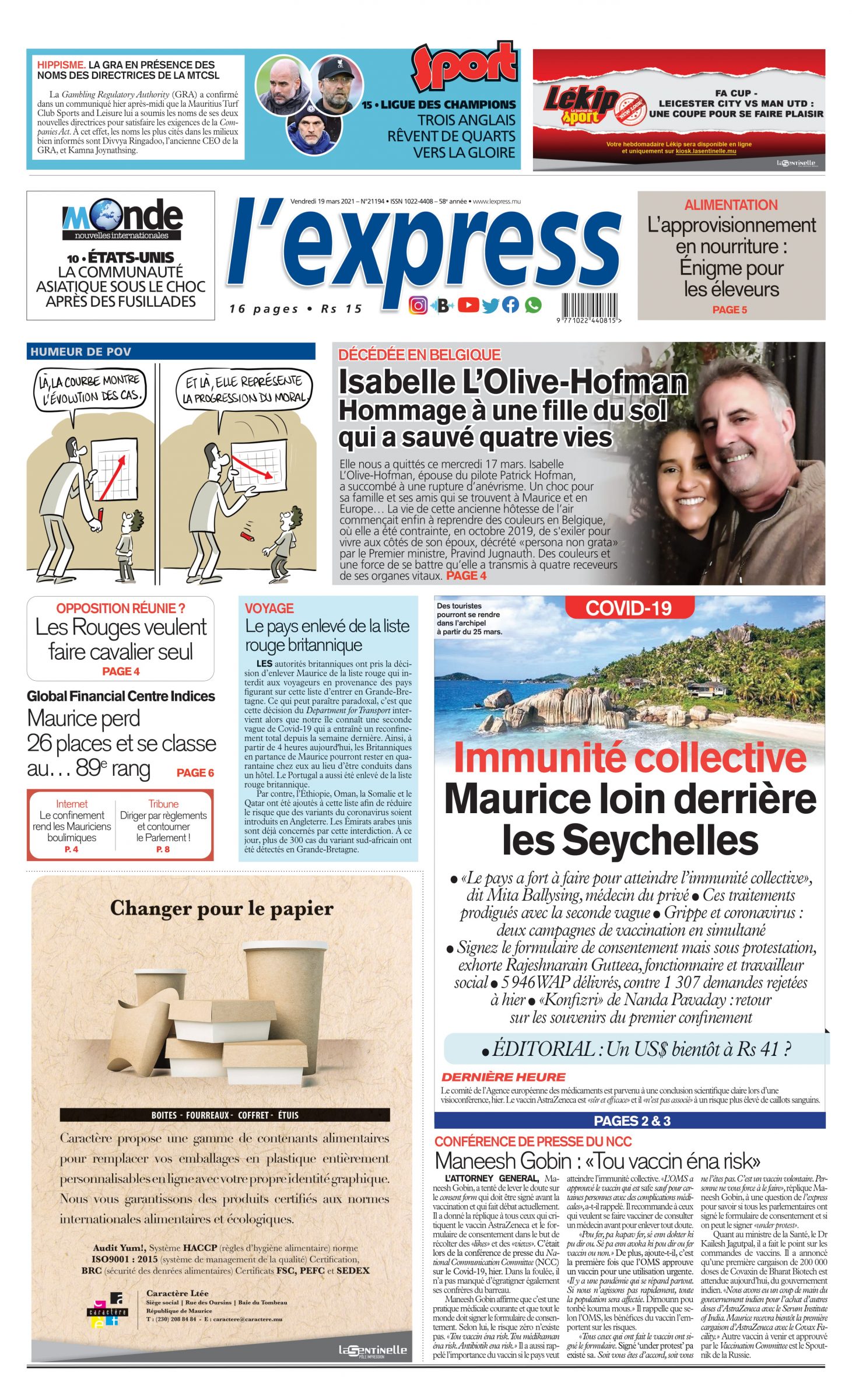 En une de l'express; Isabelle L’Olive-Hofman: Hommage à une fille du sol qui a sauvé quatre vies ; Autre titre: Immunité collective Maurice loin derrière les Seychelles