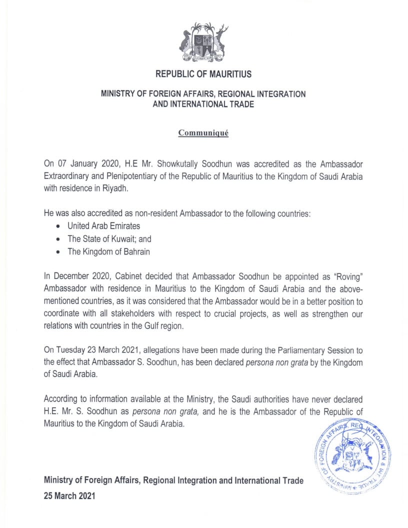 Communiqué des Affaires étrangères: Soodhun pas persona non grata en Arabie saoudite