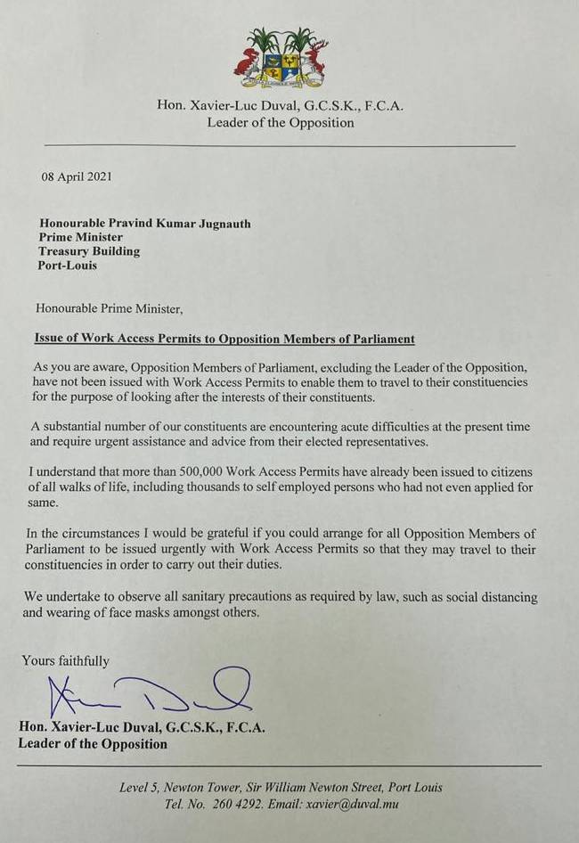Après sa déclaration d’hier, Xavier Duval, le leader de l’opposition, a adressé une lettre au Premier ministre ce jeudi 8 avril pour demander à ce que des «work access permits» soient émis pour les députés de l’opposition.